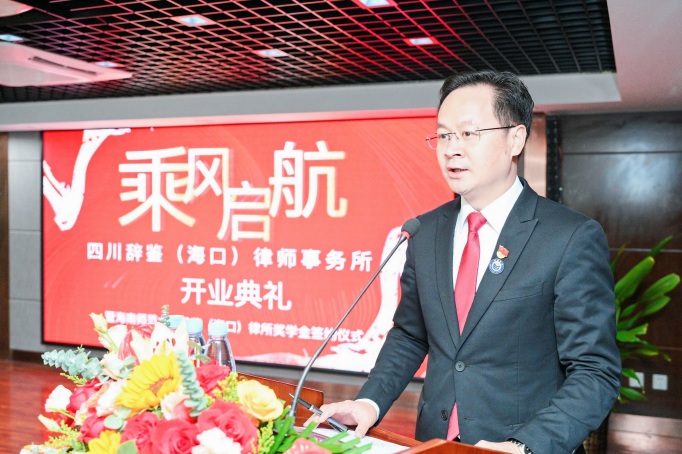 泸州市司法局党委委员、副局长、市律师行业党委书记刘喜讯女士在开业致辞中对四川辞鉴律师事务所自成立以来取得的成就表示肯定,并为四川辞鉴(海口)律师事务所落成海口表示祝福。